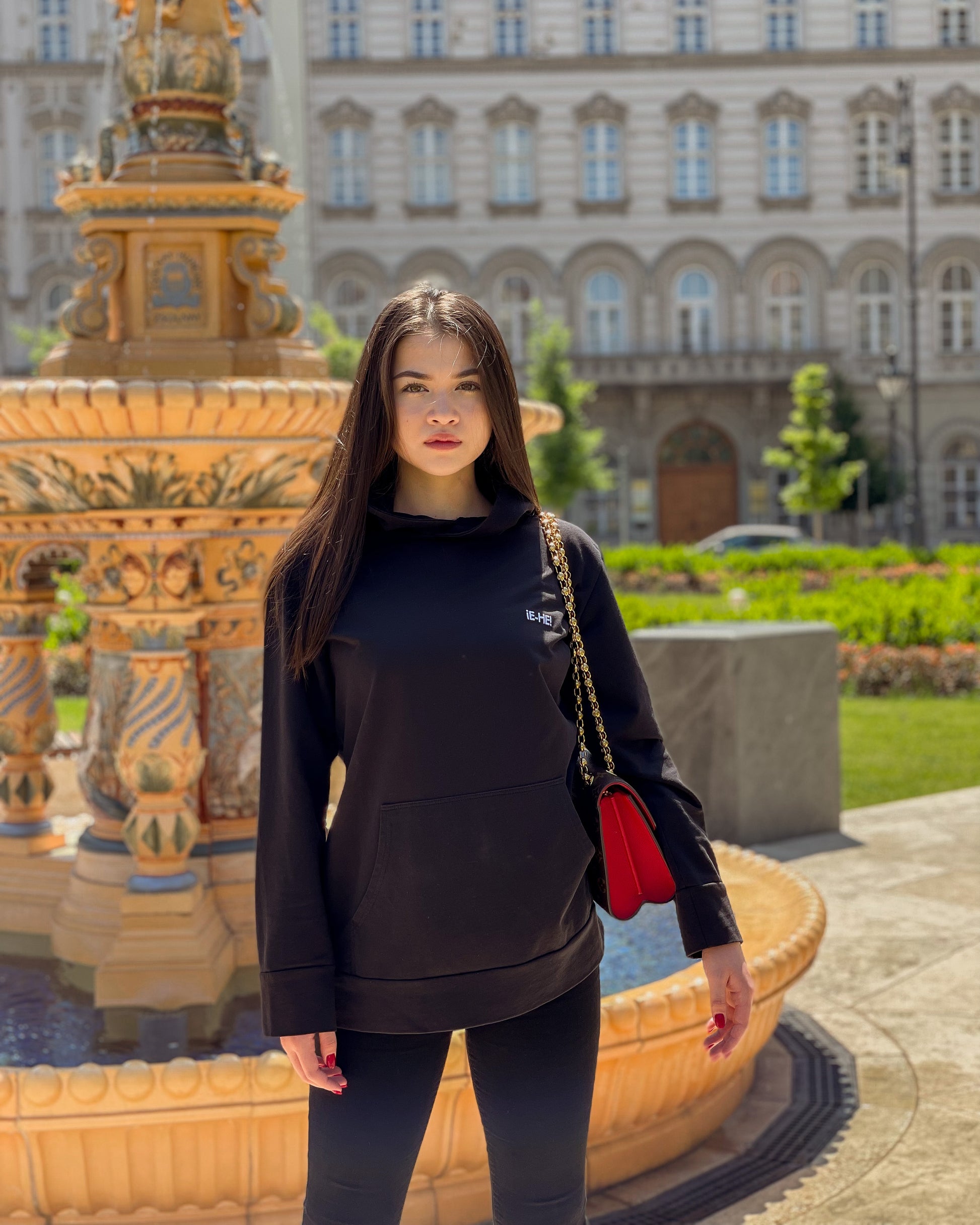 A premium hoodie in black, made with ethical production in Budapest, Hungary.